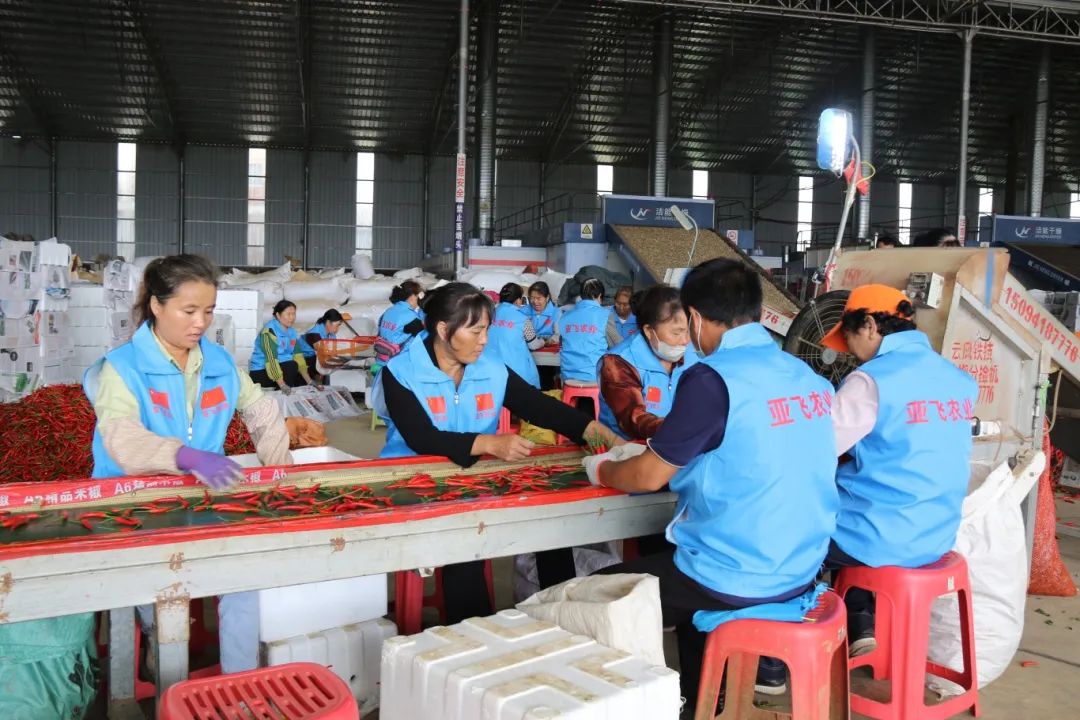 在砚山县亚飞农副产品贸易有限公司的辣椒加工车间里,火红的鲜椒铺满场地,工人们正忙着对新鲜辣椒进行分拣、装箱、过秤、打包,现场一派繁忙。