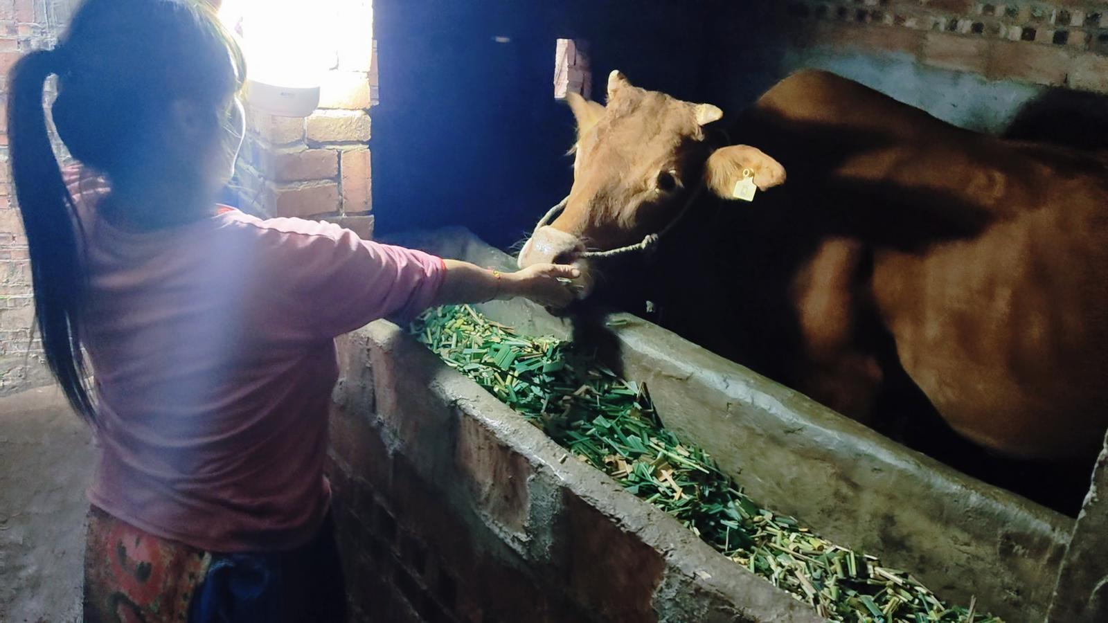 (图为大坡脚村民拿到应急照明灯后用其照明喂牛)