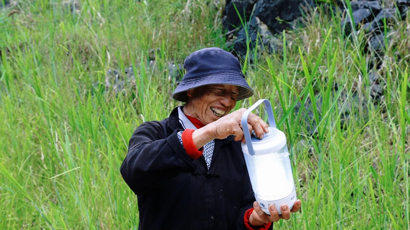 (图为大坡脚村民陶开林拿到应急照明灯喜笑颜开)