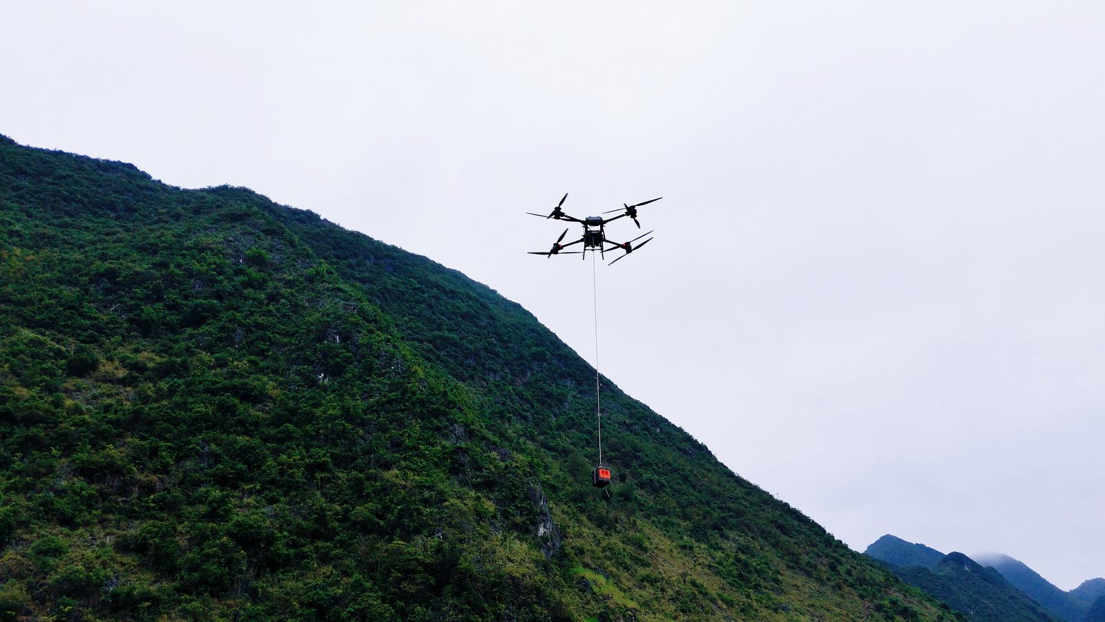 (图为重载无人机携带着便携式移动电源、应急照明灯在山间飞行)