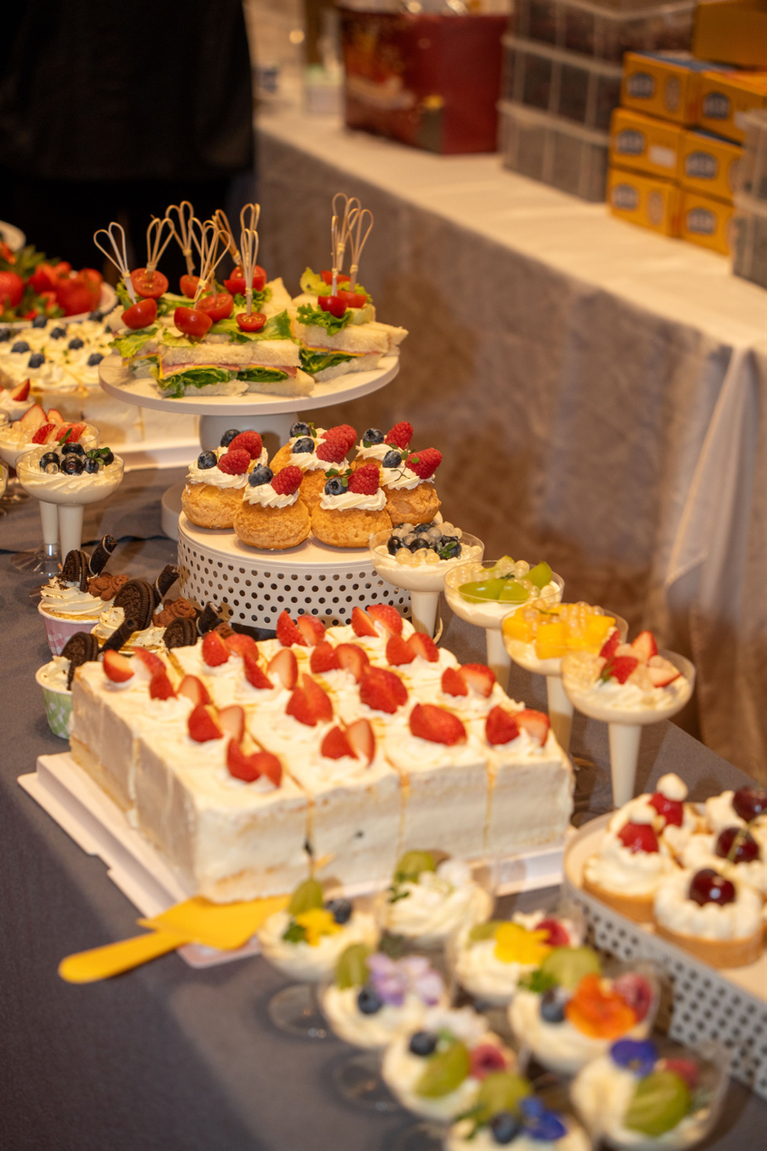 冷餐区摆放着精致的甜品与饮品,为现场增添了温馨的休闲氛围,客户们边品尝边交流,提前感受活动的欢乐。
