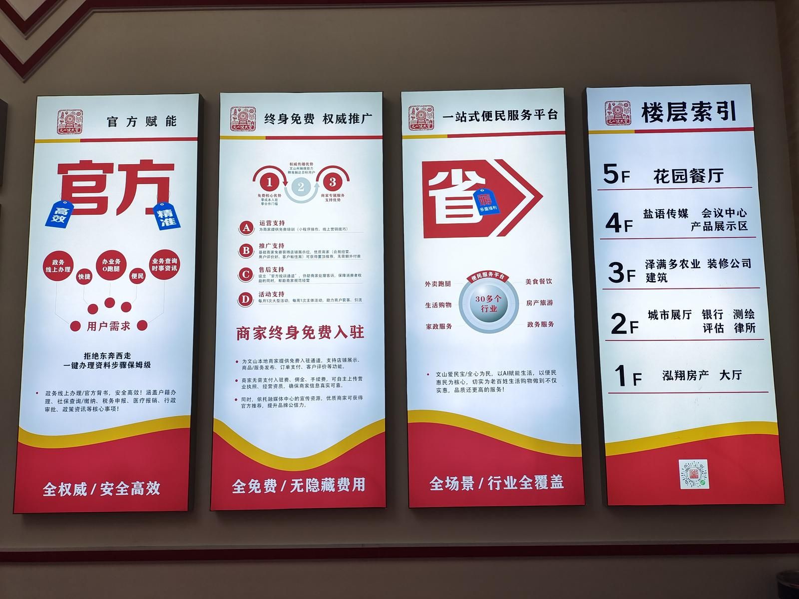据文山爱便民宝董事长田勇介绍,“文山爱便民宝”线下综合体服务中心一二楼是房产全链条专区,集城市展厅与金融、律师、测绘、评估等机构于一体,买房贷款、产权办理等事项一站式办结;三楼是产业与民生专区,农产品产销渠道、建筑装修、技能培训等服务可寻;四楼是核心运营枢纽,保障平台运转,提供政策宣讲、政企对接的专属场地;五楼花园餐厅,方便办事歇脚、商务洽谈。