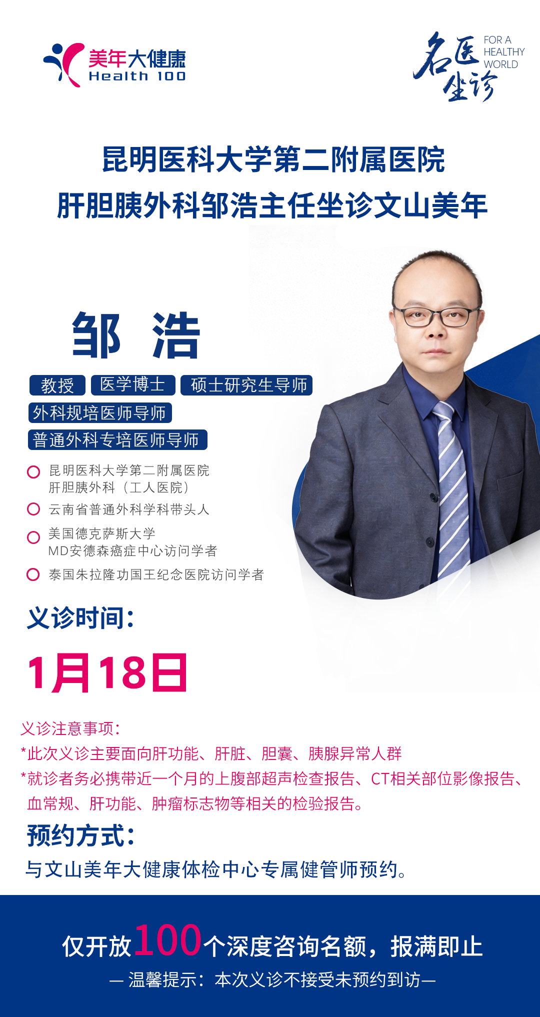 预约方式:本次义诊实行预约制,限号100人。请务必提前联系您的美年专属健康管理师预约登记,额满即止。
