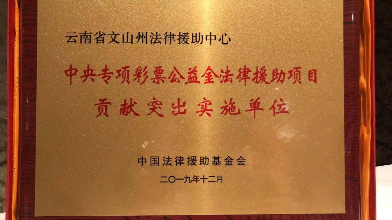 12月28日,文山州法律援助中心被中国法律援助基金会授予中央专项彩票公益金法律援助项目“贡献突出实施单位”。