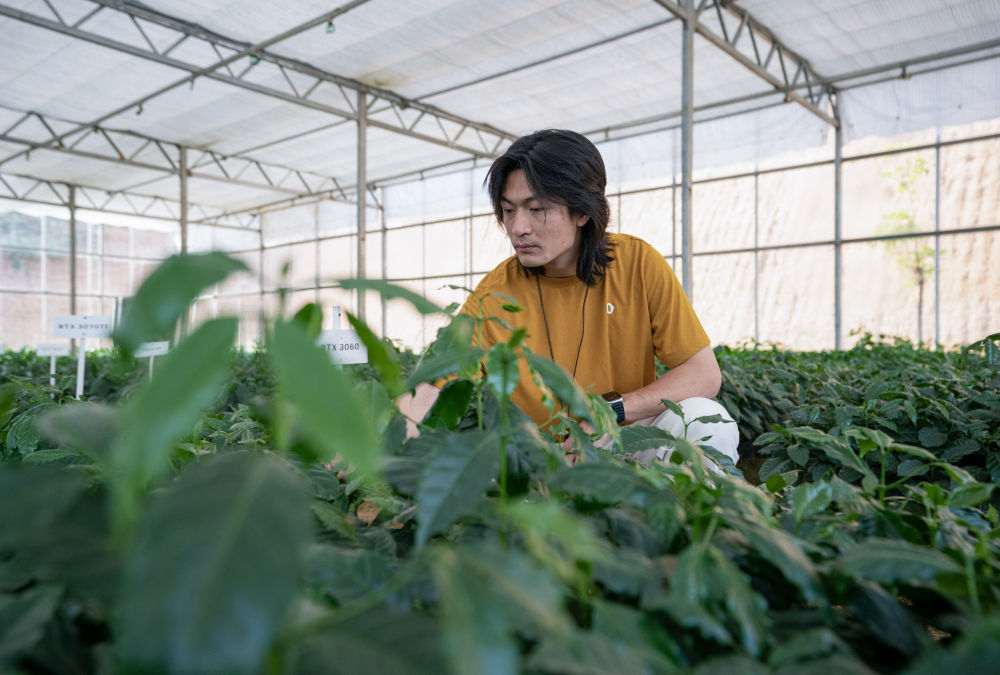 2024年3月19日,普洱市孟连县芒芒村咖啡庄园负责人陈单奇在庄园苗圃查看咖啡苗生长情况。十多年来,来自江苏的咖啡寻豆师陈单奇与孟连结缘,致力于筛选培育适合当地种植的咖啡品种,逐步积累品种优势。