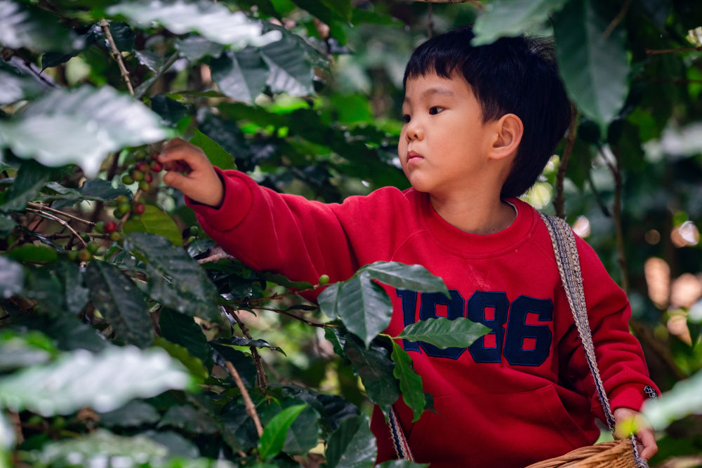 2025年1月7日,在普洱市思茅区野鸭塘河谷咖啡庄园,一名随父母来旅游的孩子体验采摘咖啡果。