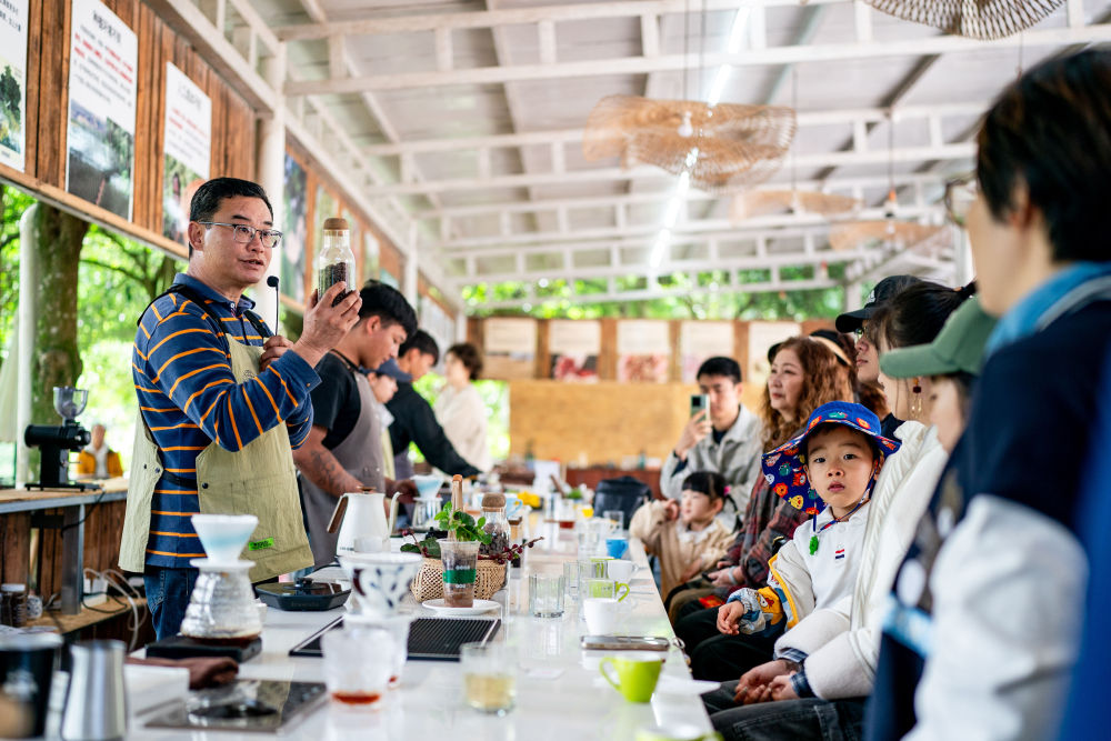 2025年1月8日,普洱市思茅区天玉咖啡庄园经营者刘晓东向游客讲解咖啡知识。