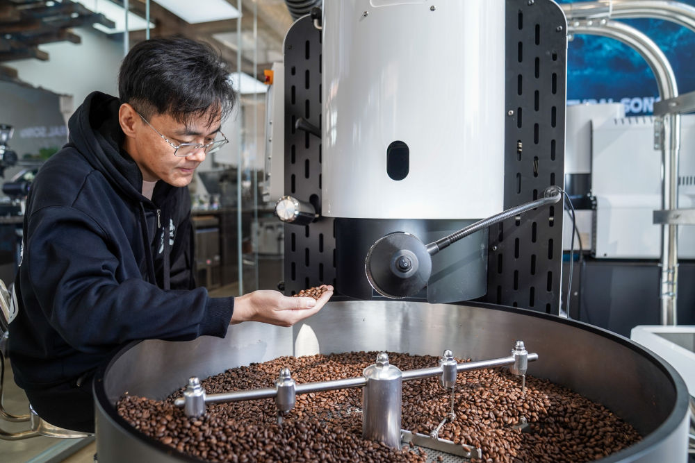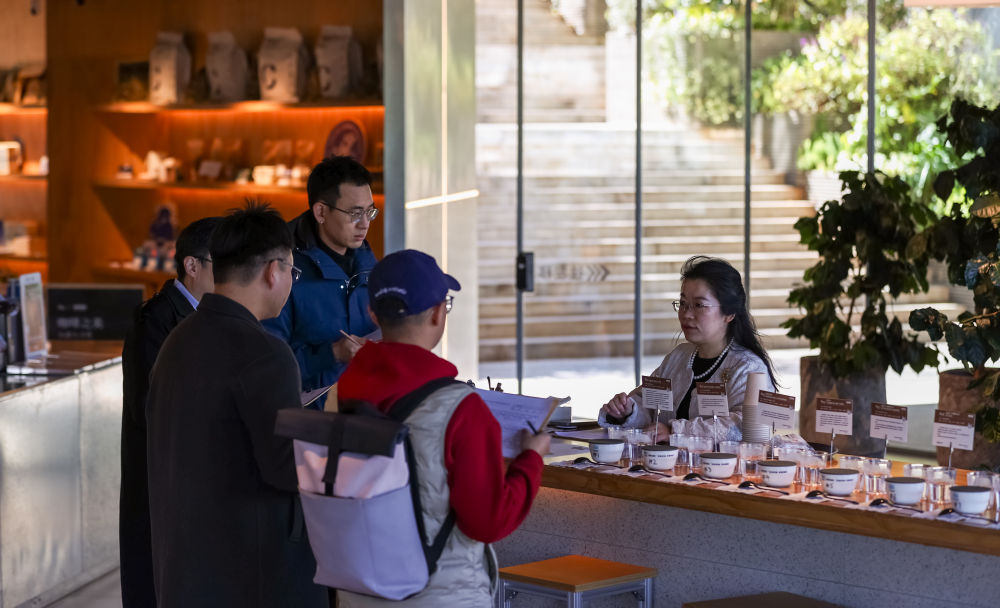 2024年,深耕咖啡行业十余年的韩君玮受聘成为云南百年老字号咖啡品牌“南来盛”的品牌总顾问,投身产品研发和品牌推广。一年多来,他每月都会来到昆明,短则几天,长则数周,开启了一种“半旅居、半工作”的生活模式。这是韩君玮在位于昆明的南来盛咖啡店内监督咖啡生产工艺(2025年12月10日摄)。