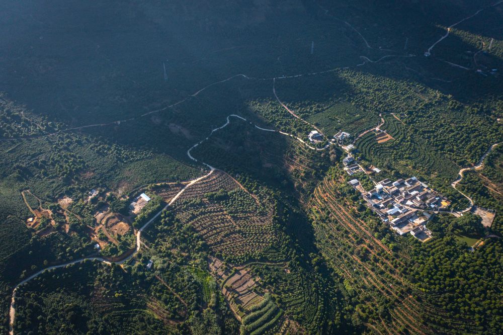 这是2025年11月16日在保山市隆阳区新寨村拍摄的咖啡园(无人机照片)。保山市西靠高黎贡山、东临怒江,其独特的干热河谷气候提供了得天独厚的咖啡种植条件。保山小粒咖啡“浓而不苦,香而不烈,略带果酸”,是国家认定的地理标志产品。