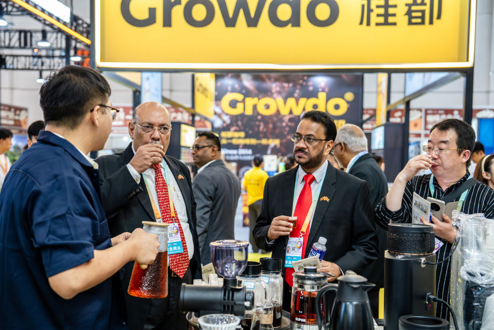 2025年6月19日,海外观众在于昆明举办的第9届中国—南亚博览会上品尝云南咖啡。
