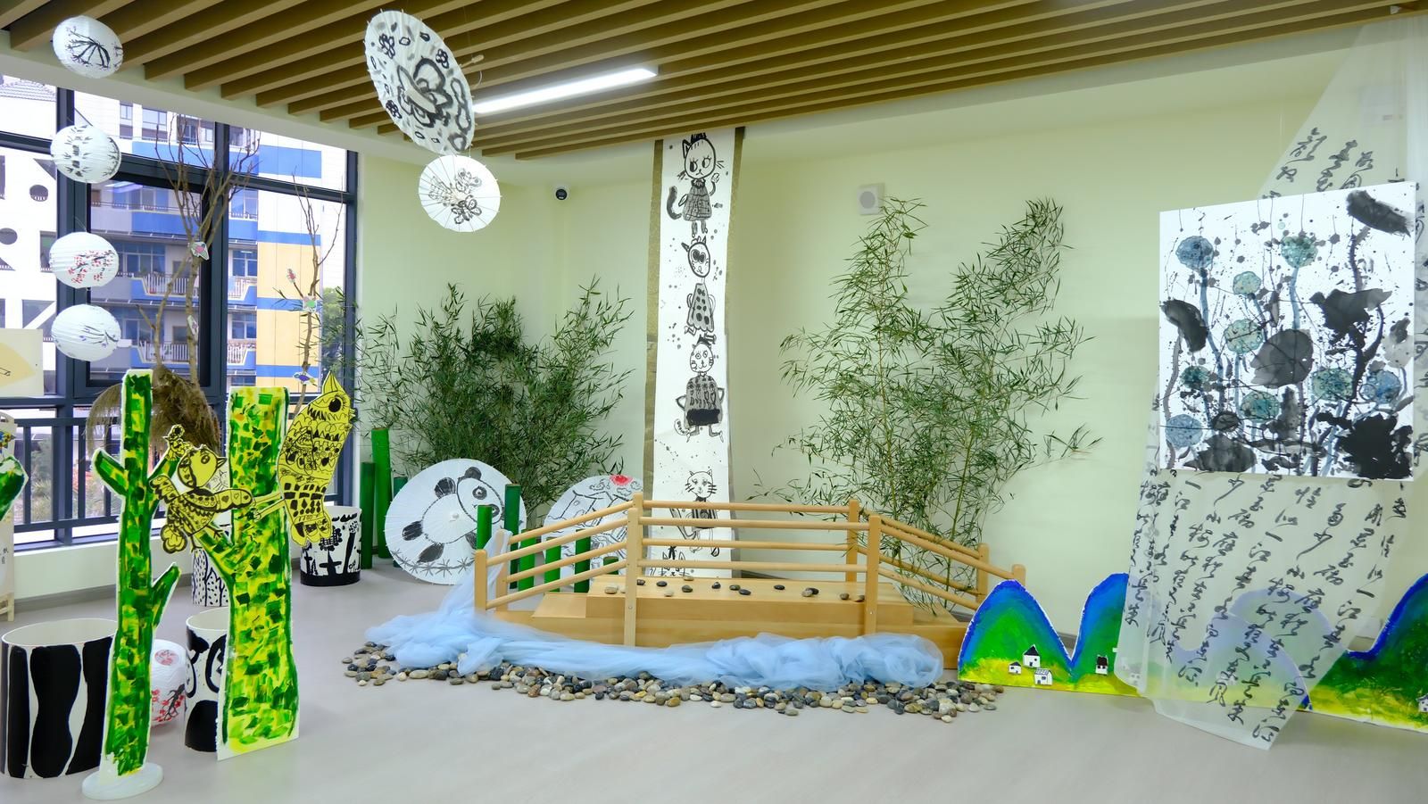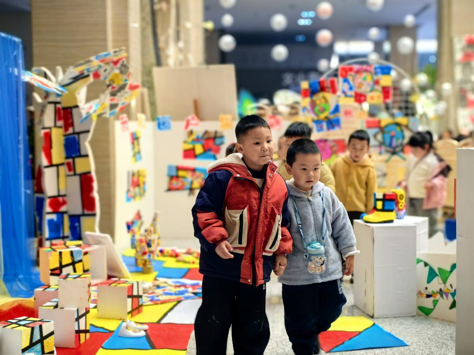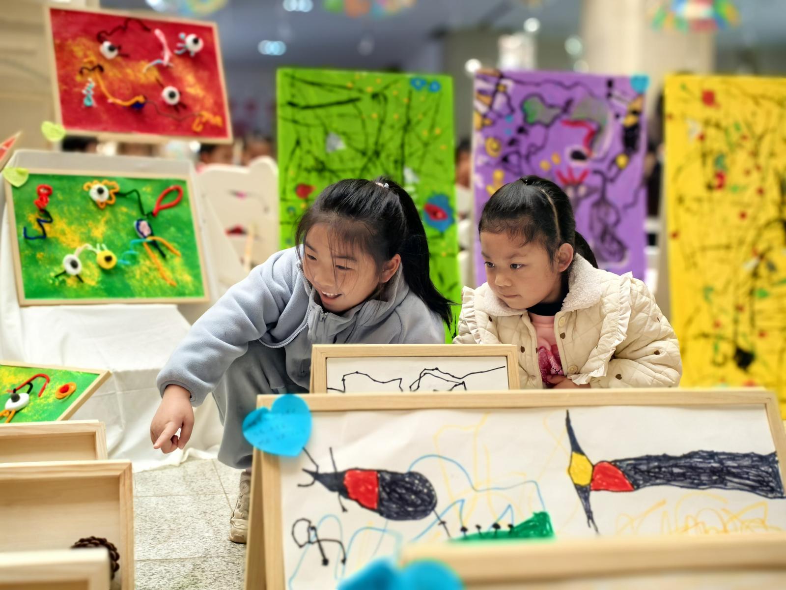 画展巧妙融合了大师艺术元素与儿童天真视角。让米罗笔下的抽象线条,在孩子们的画中化作跳跃的梦境符号;吴冠中标志性的水墨点线,晕染出满含童趣的山水意境;蒙德里安的几何色块,被重组为灵动鲜活的童年节奏;马蒂斯的大胆色彩与波洛克的泼洒技法,则在幼儿的创作中焕发全新生命力。每一幅作品皆非简单复刻,而是孩子们情感与想象的自由宣泄,尽显童真世界的艺术张力。